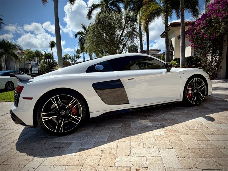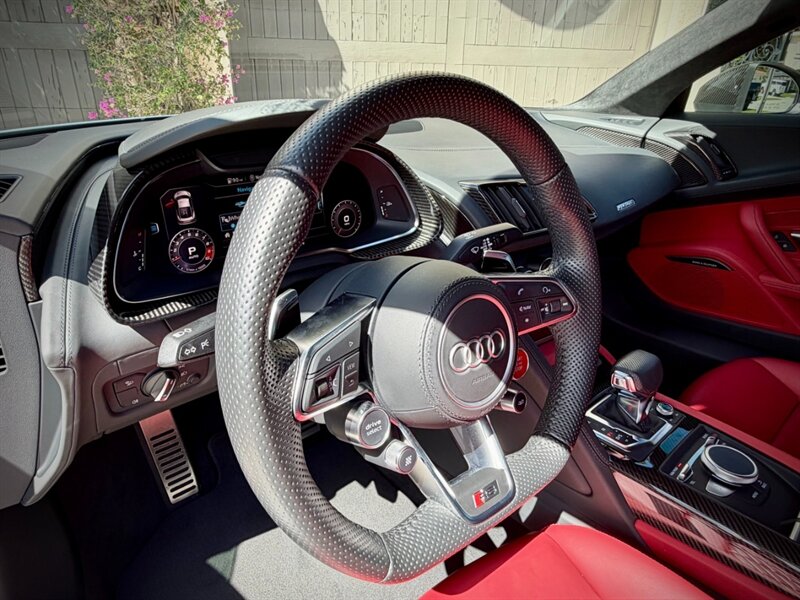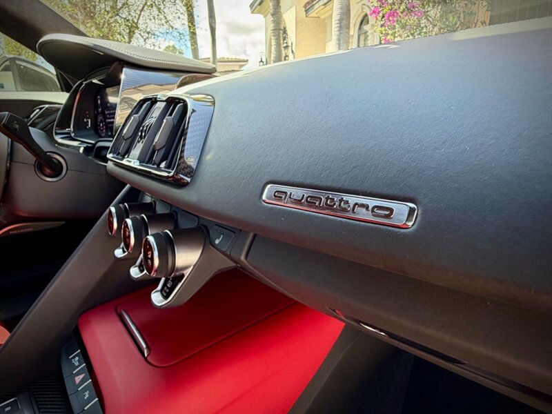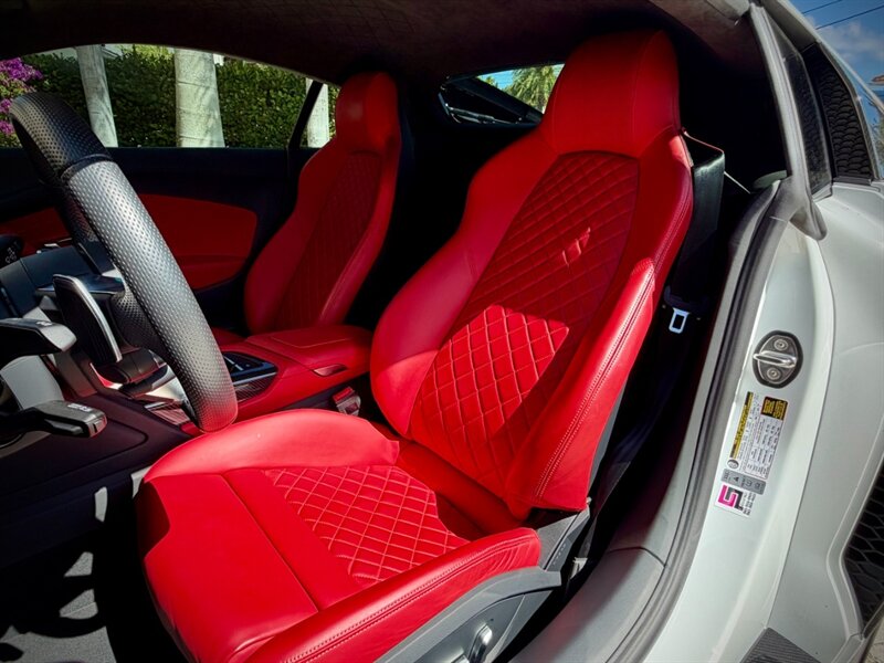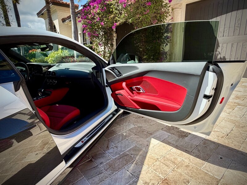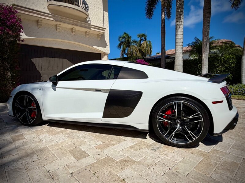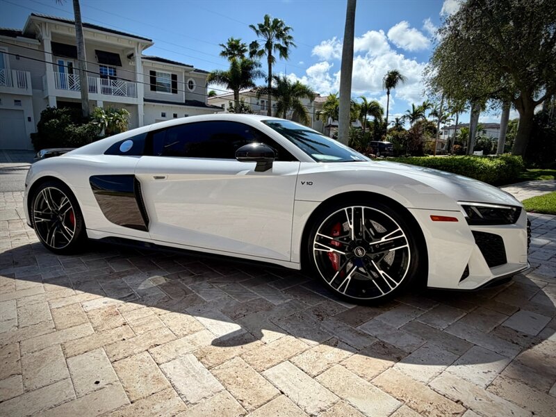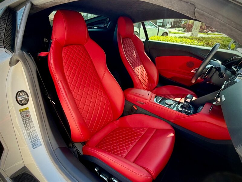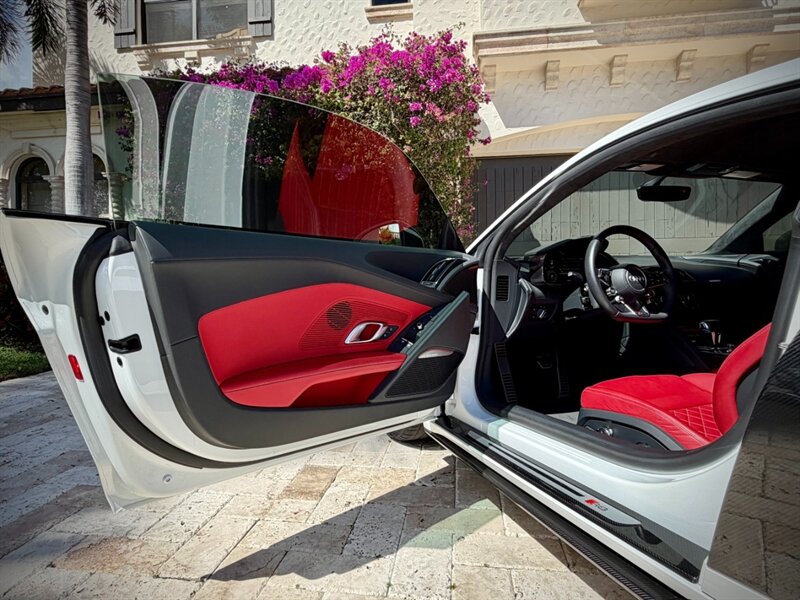 2022 Audi R8 V10 Performance quattro — Ibis White exterior / Express Red leather interior with Steel Gray stitching. 5.2L naturally aspirated V10 producing 602 hp and 413 ft-lbs of torque, paired with Audi’s 7-speed S tronic dual-clutch transmission and quattro all-wheel-drive. Below 7,000 miles (averaging under 2,000 miles per year). Fuel economy: 13 MPG city / 19 MPG highway. Excellent overall condition.