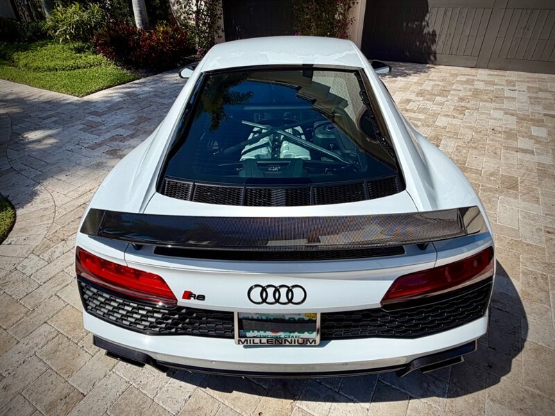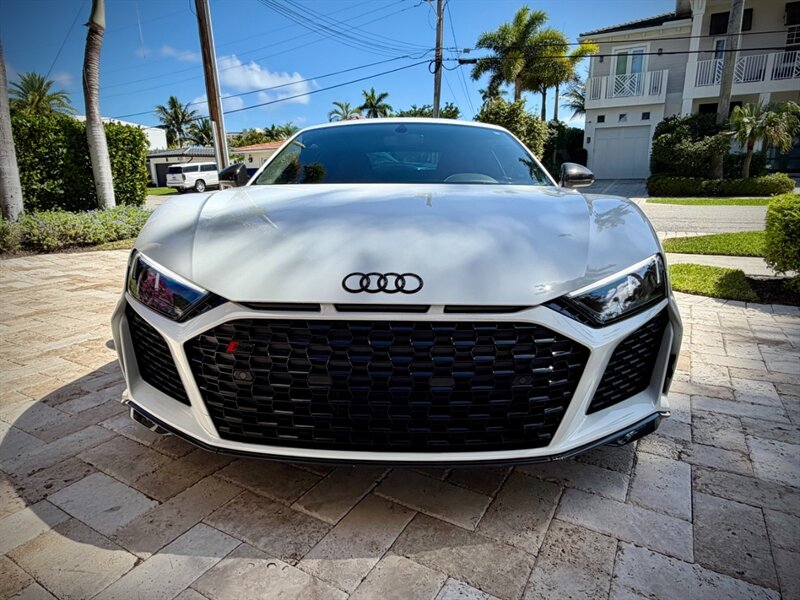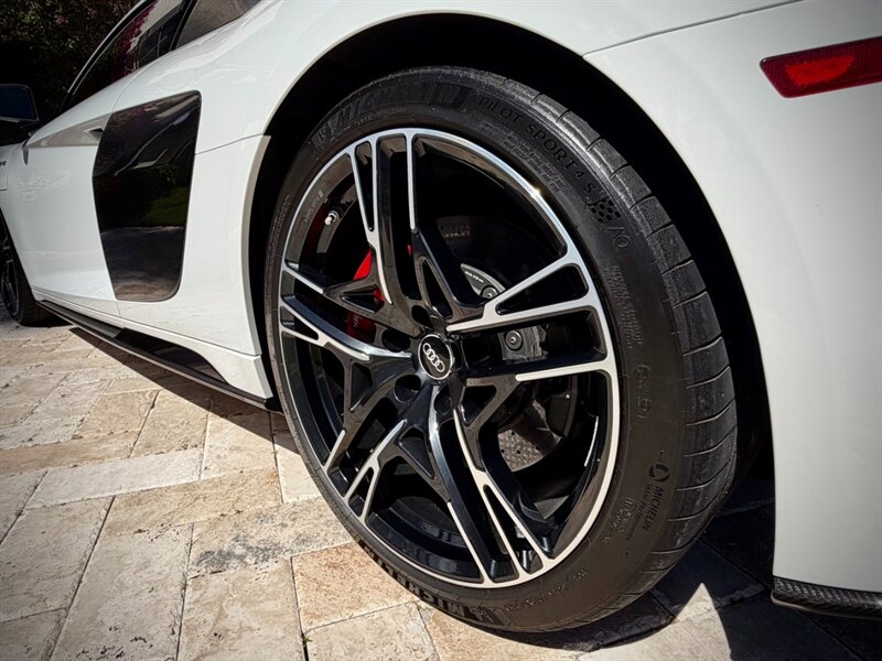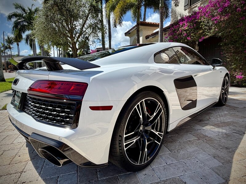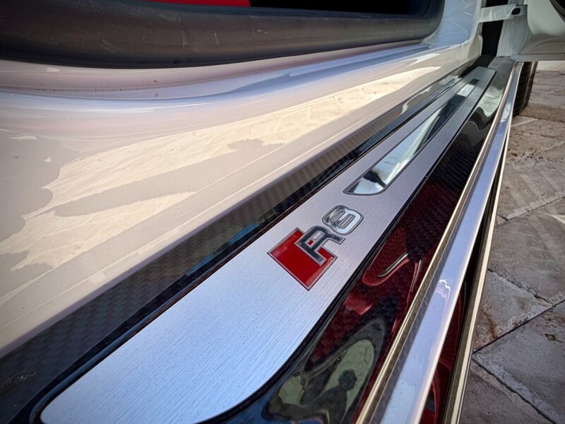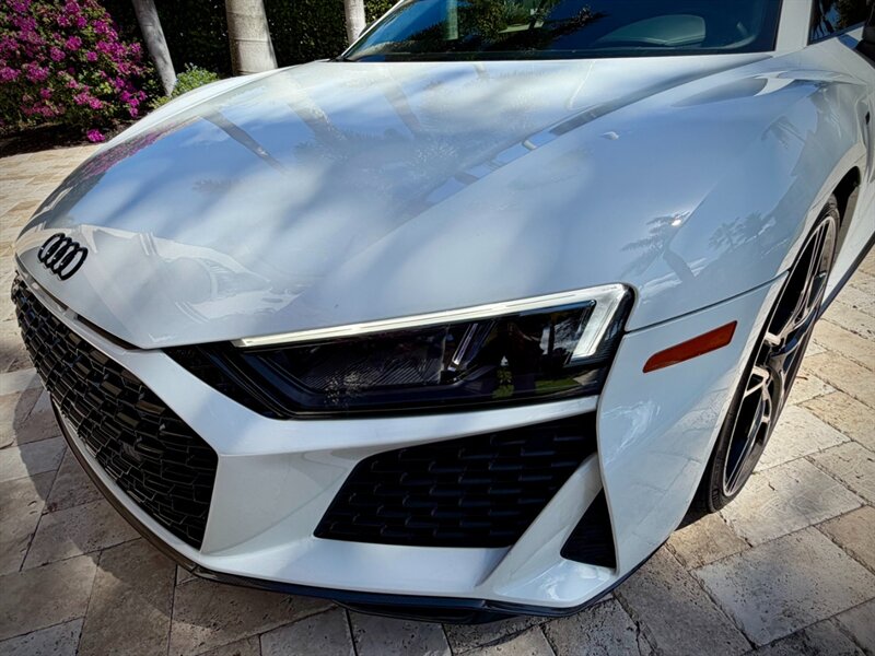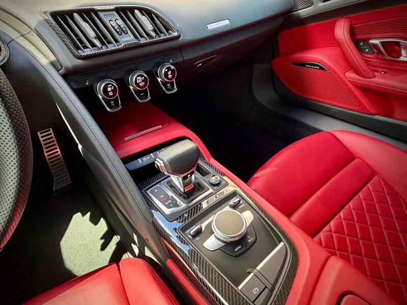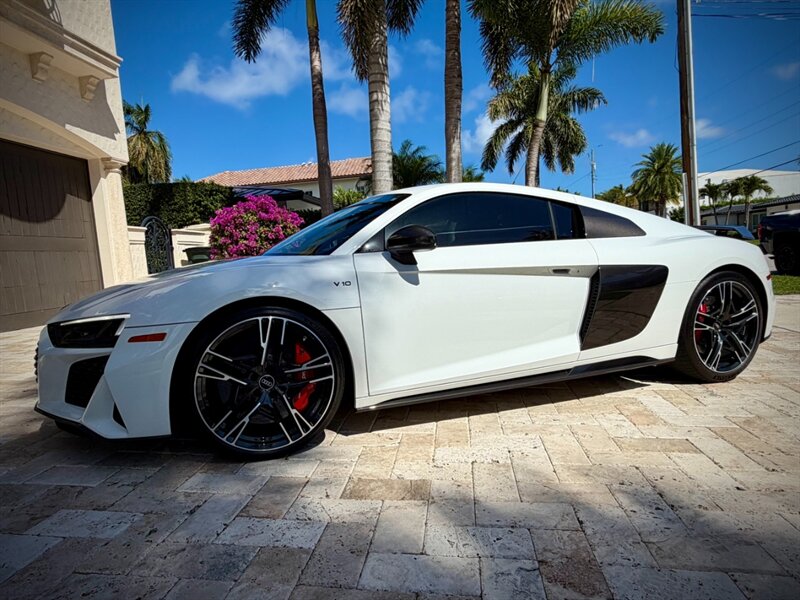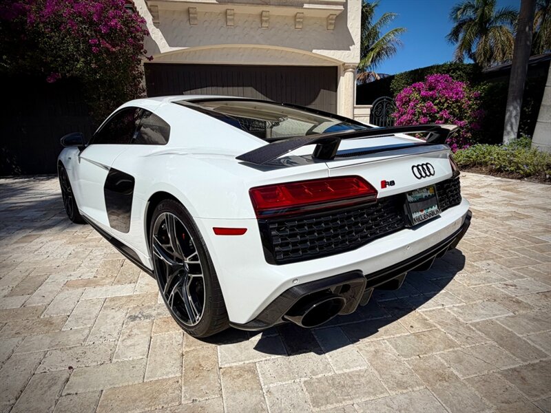 2022 Audi R8 V10 Performance quattro — Ibis White exterior / Express Red leather interior with Steel Gray stitching. 5.2L naturally aspirated V10 producing 602 hp and 413 ft-lbs of torque, paired with Audi’s 7-speed S tronic dual-clutch transmission and quattro all-wheel-drive. Below 7,000 miles (averaging under 2,000 miles per year). Fuel economy: 13 MPG city / 19 MPG highway. Excellent overall condition.