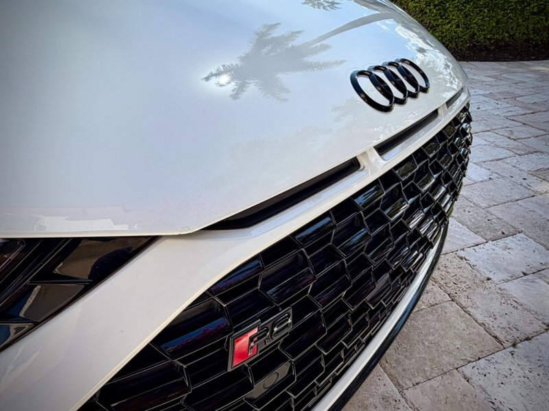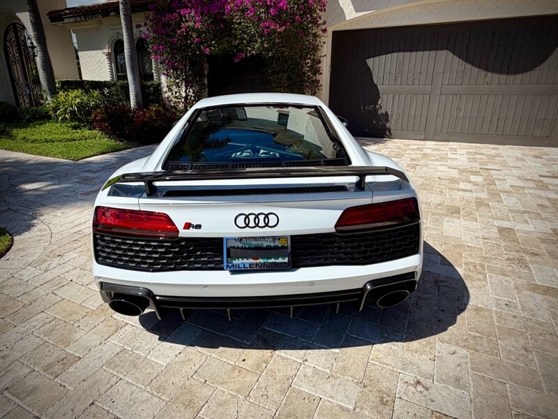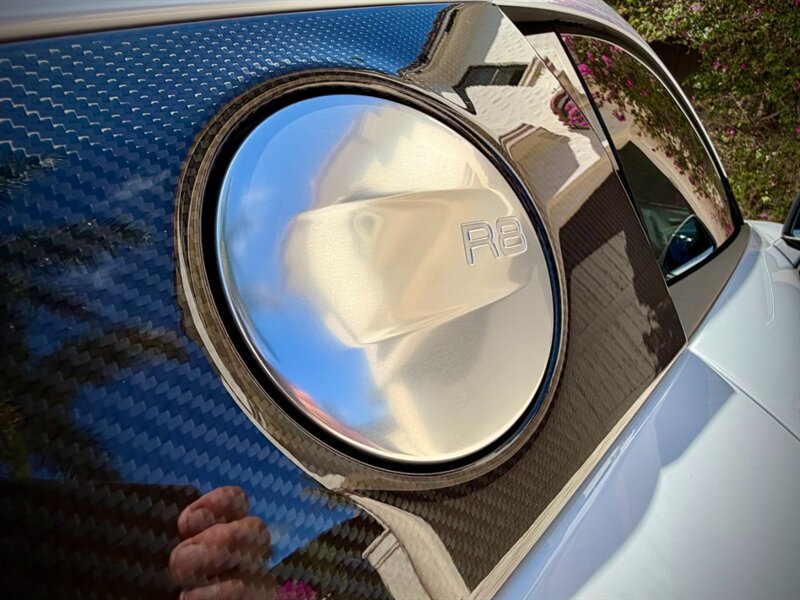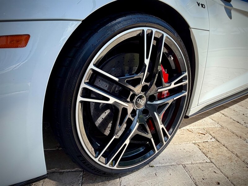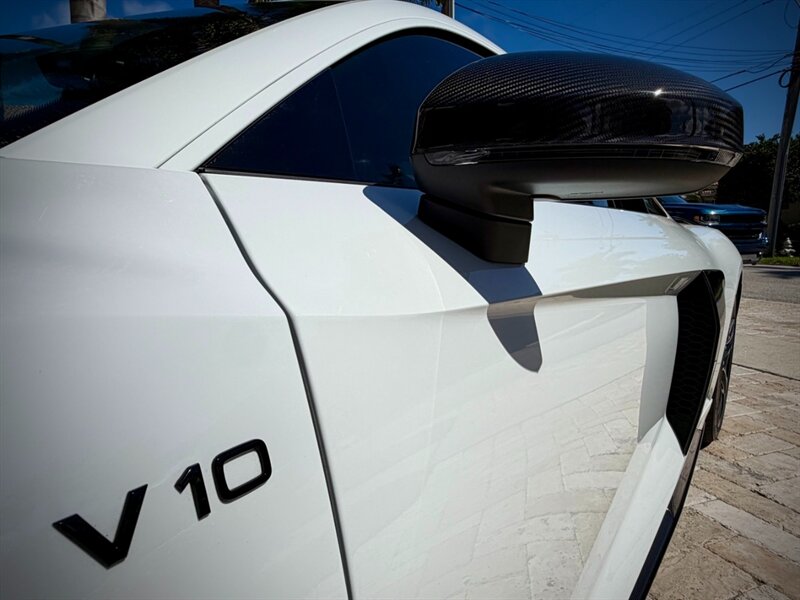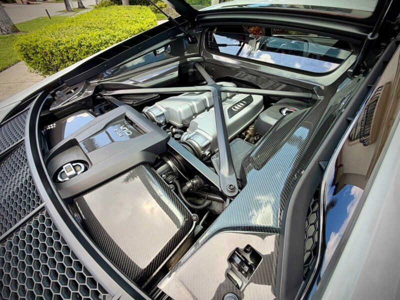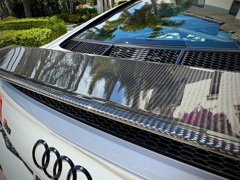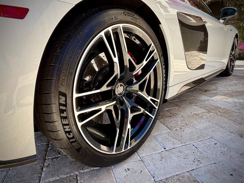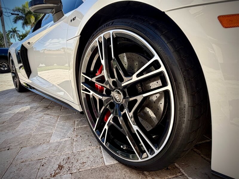 2022 Audi R8 V10 Performance quattro — Ibis White exterior / Express Red leather interior with Steel Gray stitching. 5.2L naturally aspirated V10 producing 602 hp and 413 ft-lbs of torque, paired with Audi’s 7-speed S tronic dual-clutch transmission and quattro all-wheel-drive. Below 7,000 miles (averaging under 2,000 miles per year). Fuel economy: 13 MPG city / 19 MPG highway. Excellent overall condition.